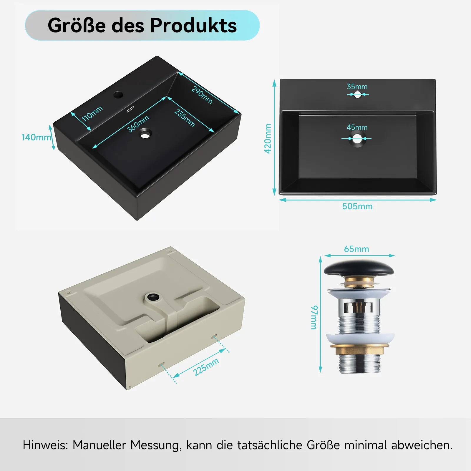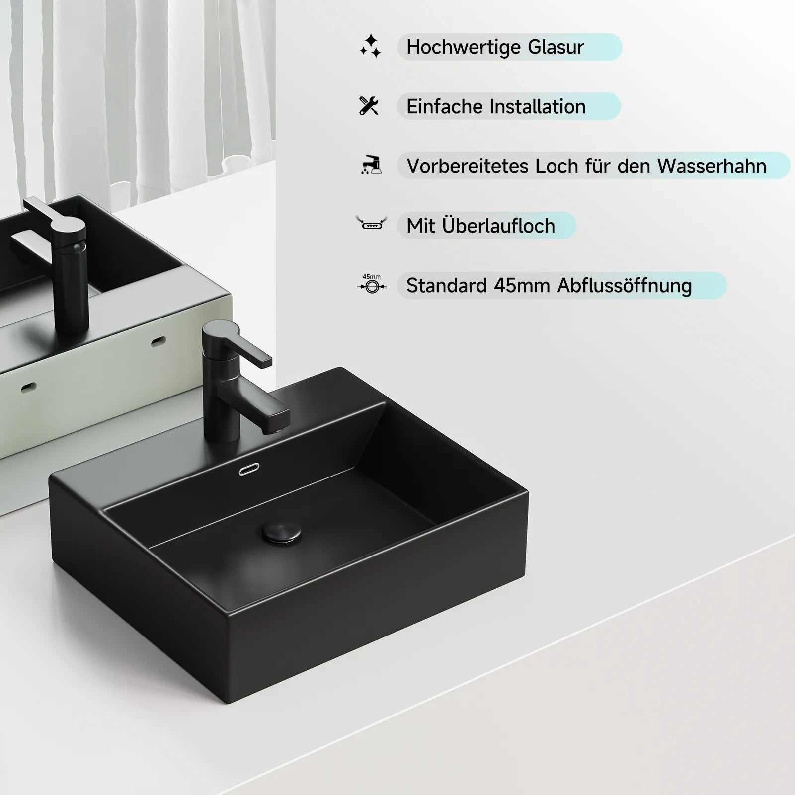 Integriertes Überlaufloch gegen Überschwemmung. Pop-up-Ventil inklusive – dicht & leicht zu bedienen.