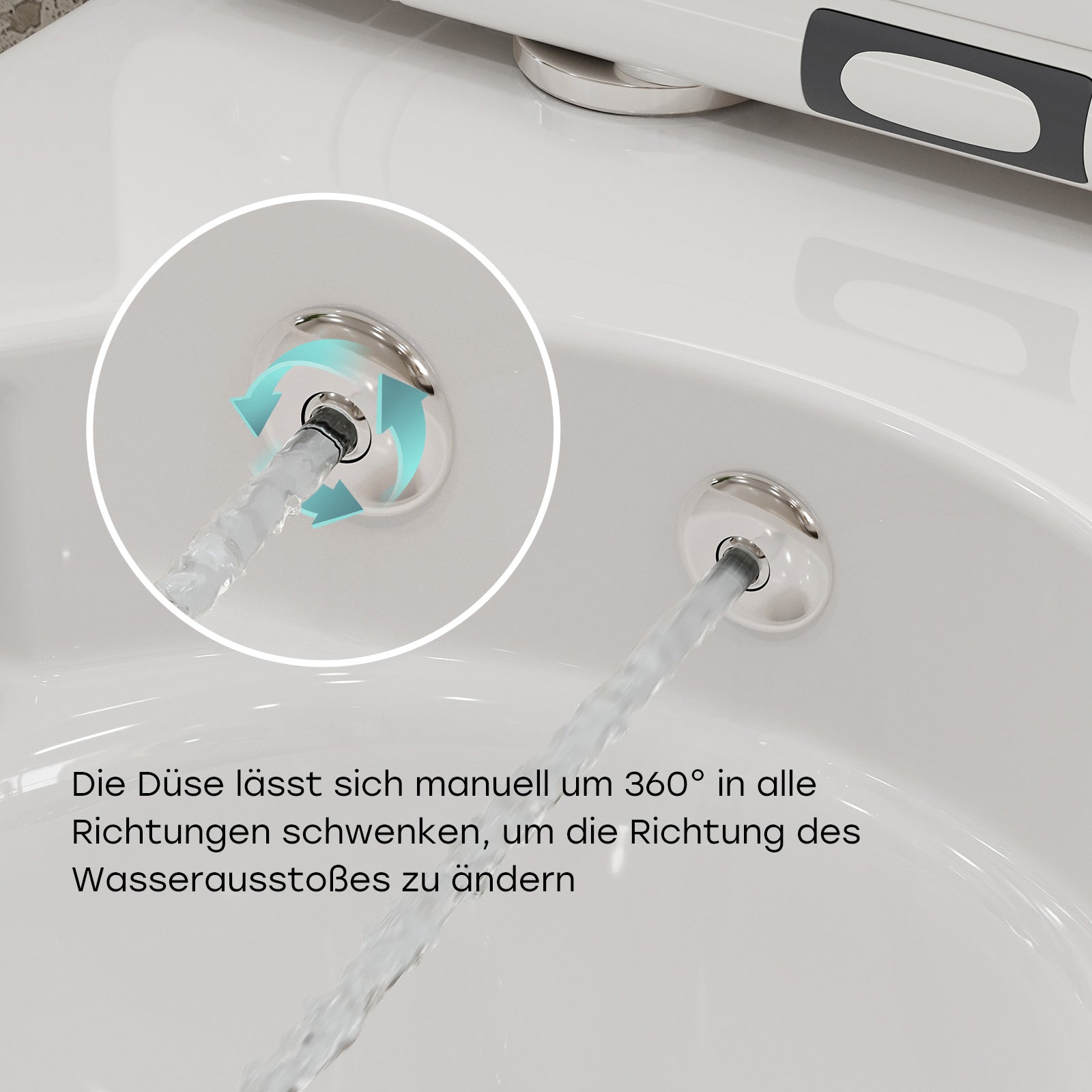 The nozzle supports manual 360° adjustment of the spray angle and is suitable for various applications – e.g., after using the toilet, during menstruation, or for postpartum care. The water jet can be precisely directed to the desired area, significantly improving comfort and hygiene.