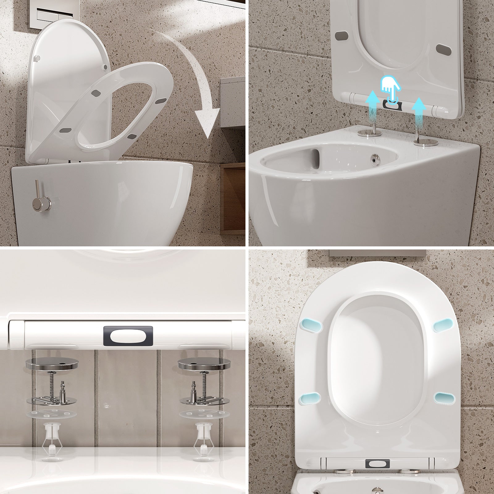 The toilet seat is equipped with a soft-close hinge that closes slowly and quietly to prevent impacts on the ceramic bowl and extend its lifespan. Even nighttime use won't disturb anyone. The UF material is exceptionally hard, impact-resistant, smooth, dirt-repellent, and easy to clean.