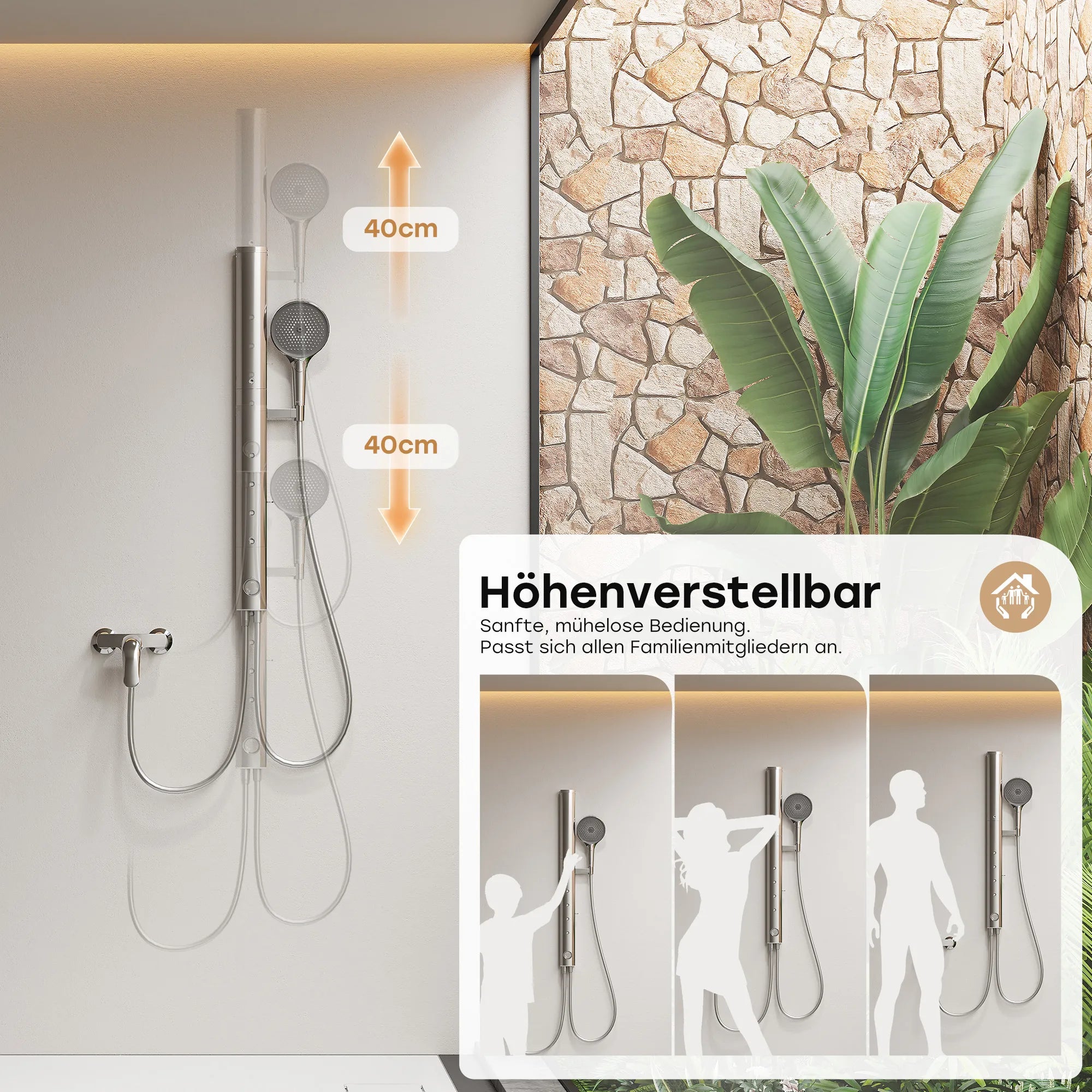 Die höhenverstellbare Duschstange lässt sich flexibel an unterschiedliche Körpergrößen anpassen und bietet maximalen Komfort für die ganze Familie.