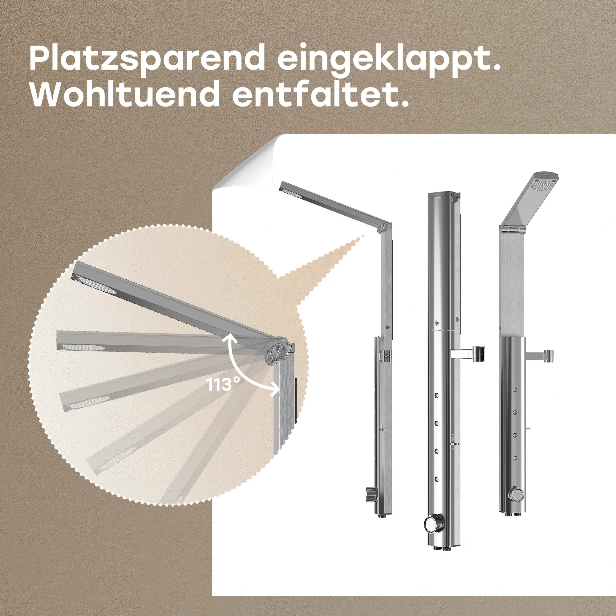 Der Duscharm kann bei Bedarf einfach eingeklappt werden, wodurch mehr Platz im Badezimmer geschaffen wird.