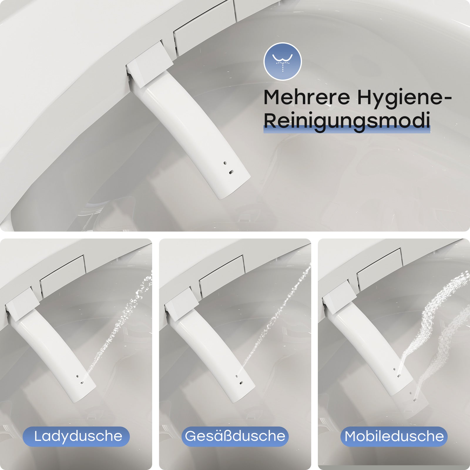 Separate Sprühdüsen für Gesäß- und Ladydusche bieten eine sanfte, gründliche Reinigung für alle Bedürfnisse.