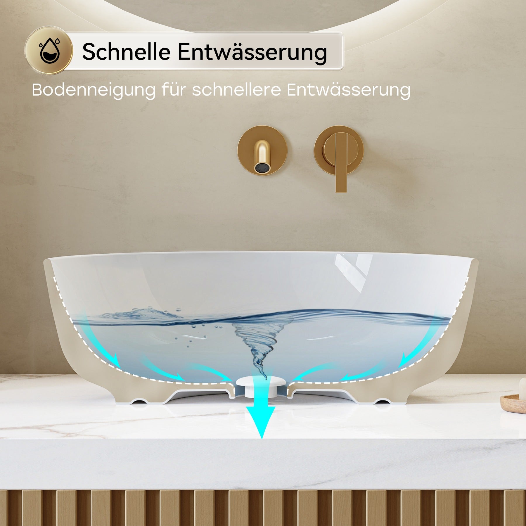 Aufsatzwaschbecken zur schnellen Montage. Ablauf nach deutscher Norm, kompatibel mit Standardabläufen (Ablaufgarnitur nicht enthalten).