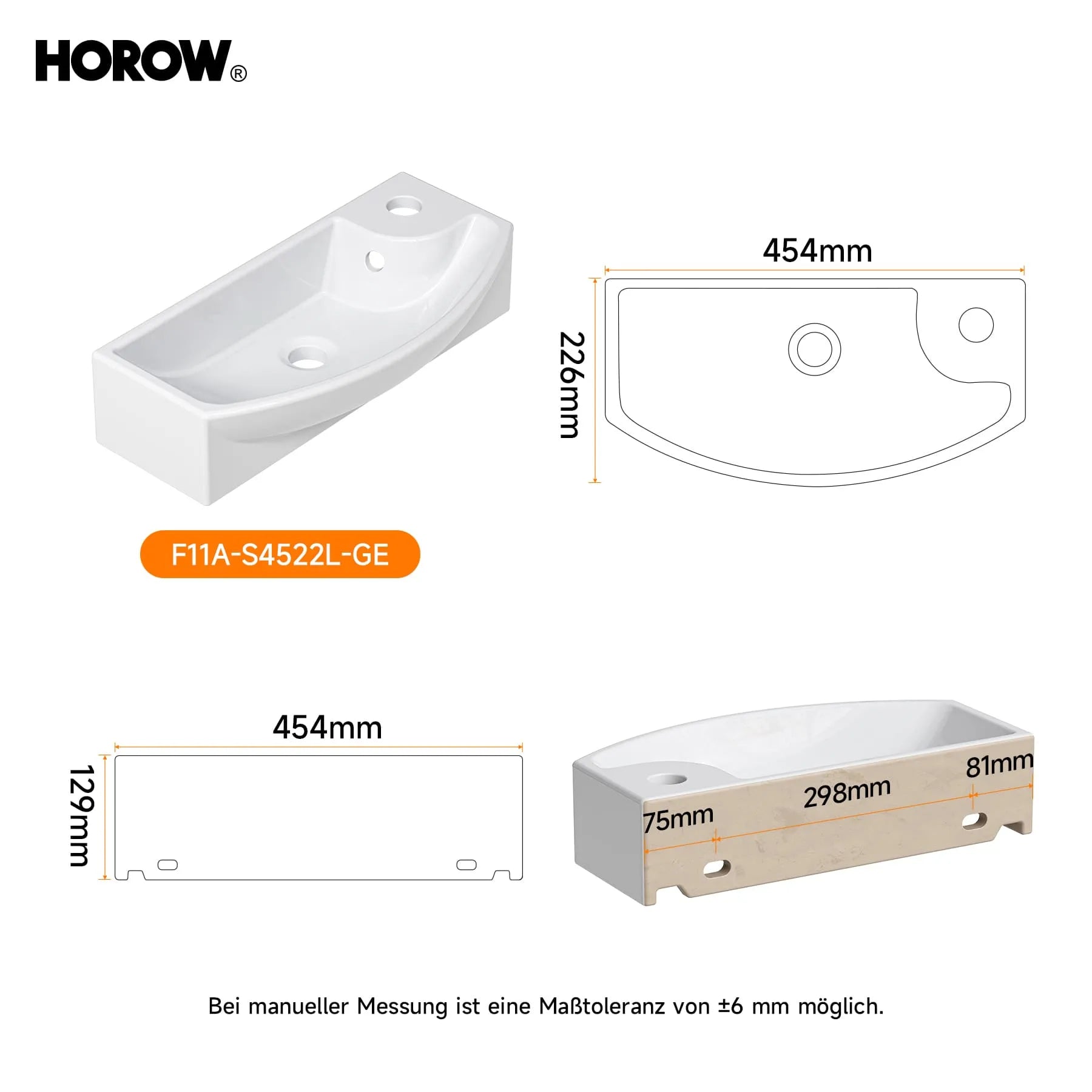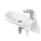 Kompakt & praktisch: 45 × 22 × 13 cm, rechteckig, mit Hahnloch rechts und Überlauf – perfekt für kleine Badezimmer und Gäste-WCs.