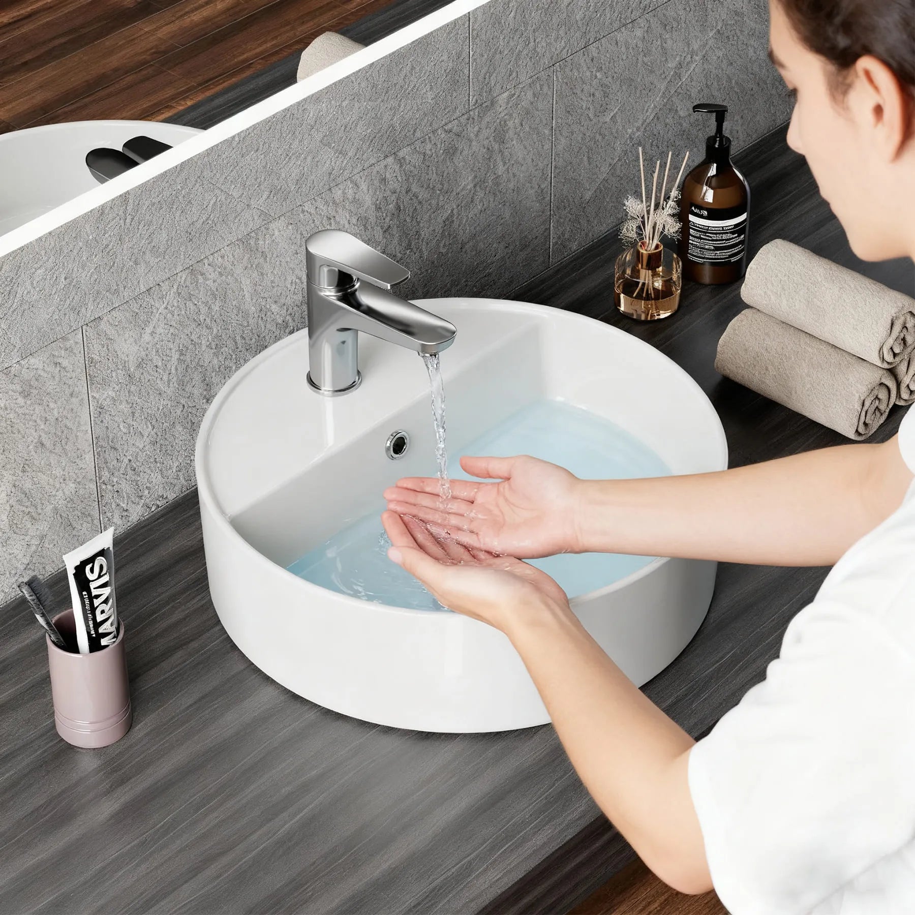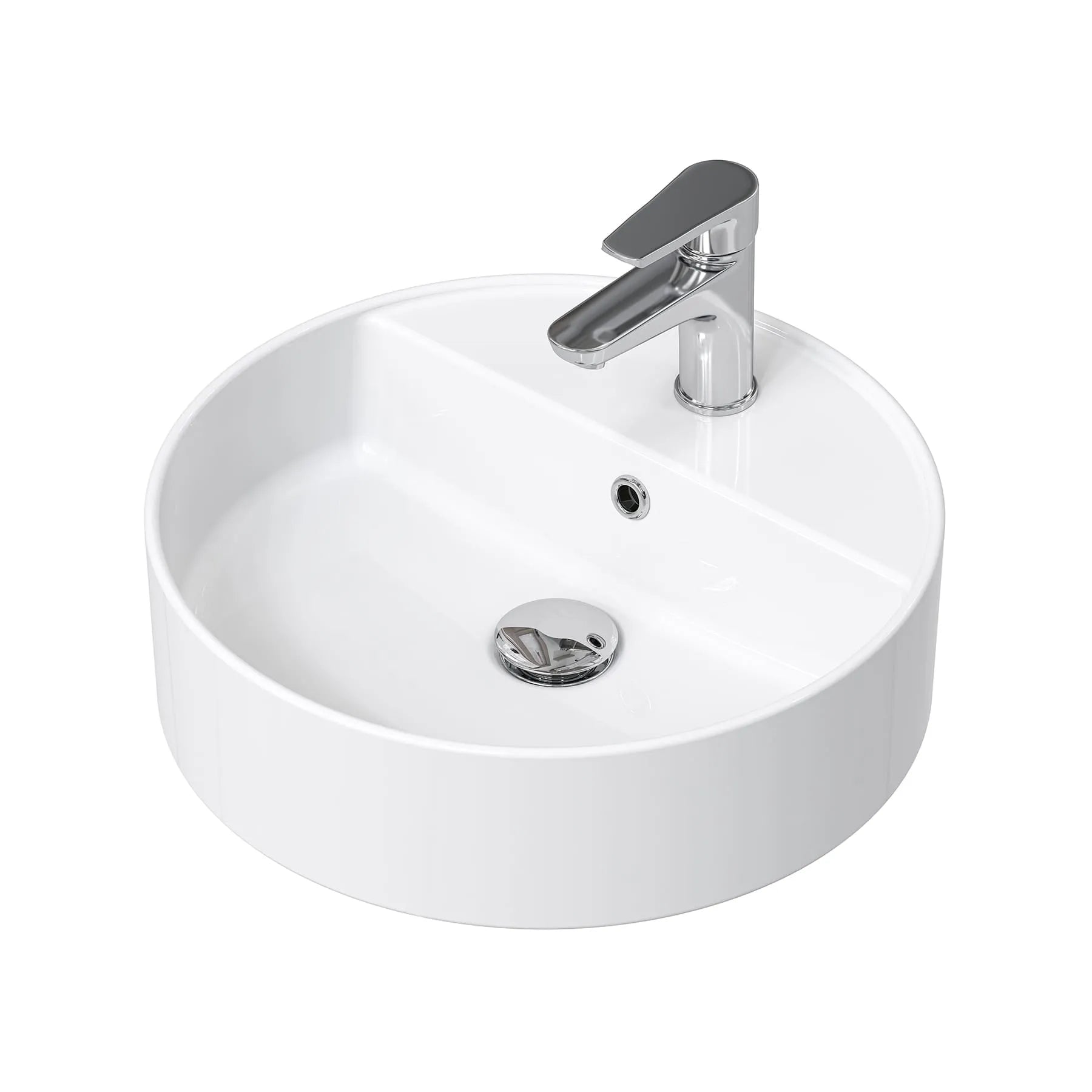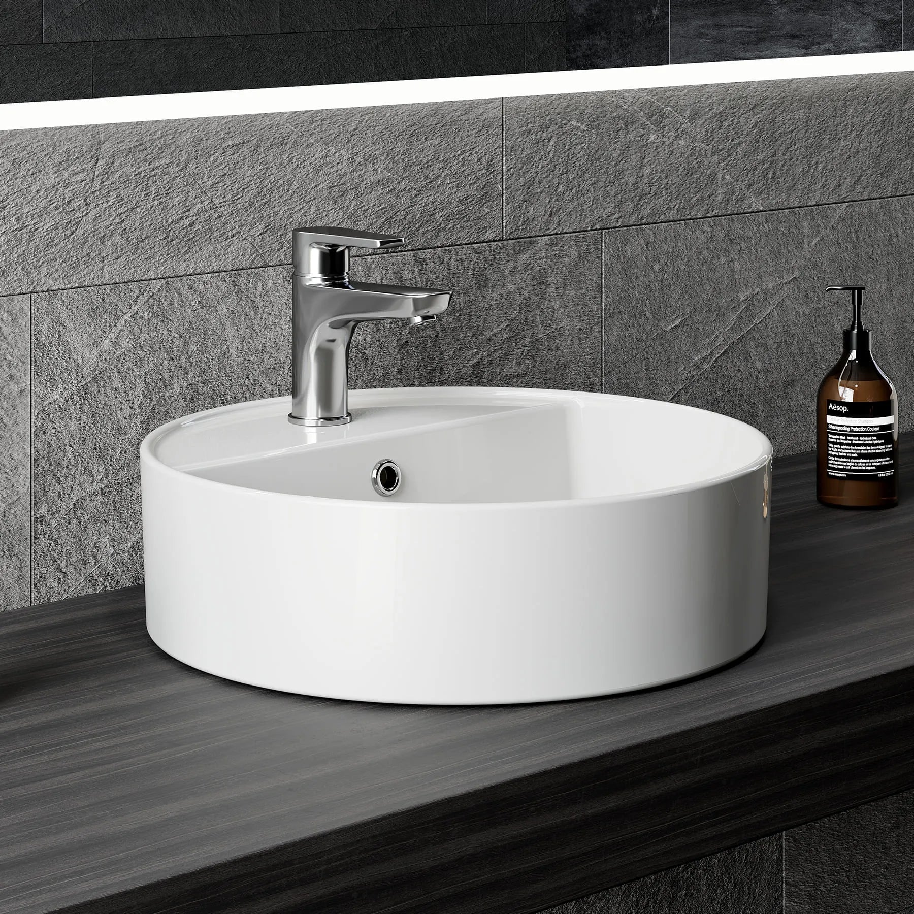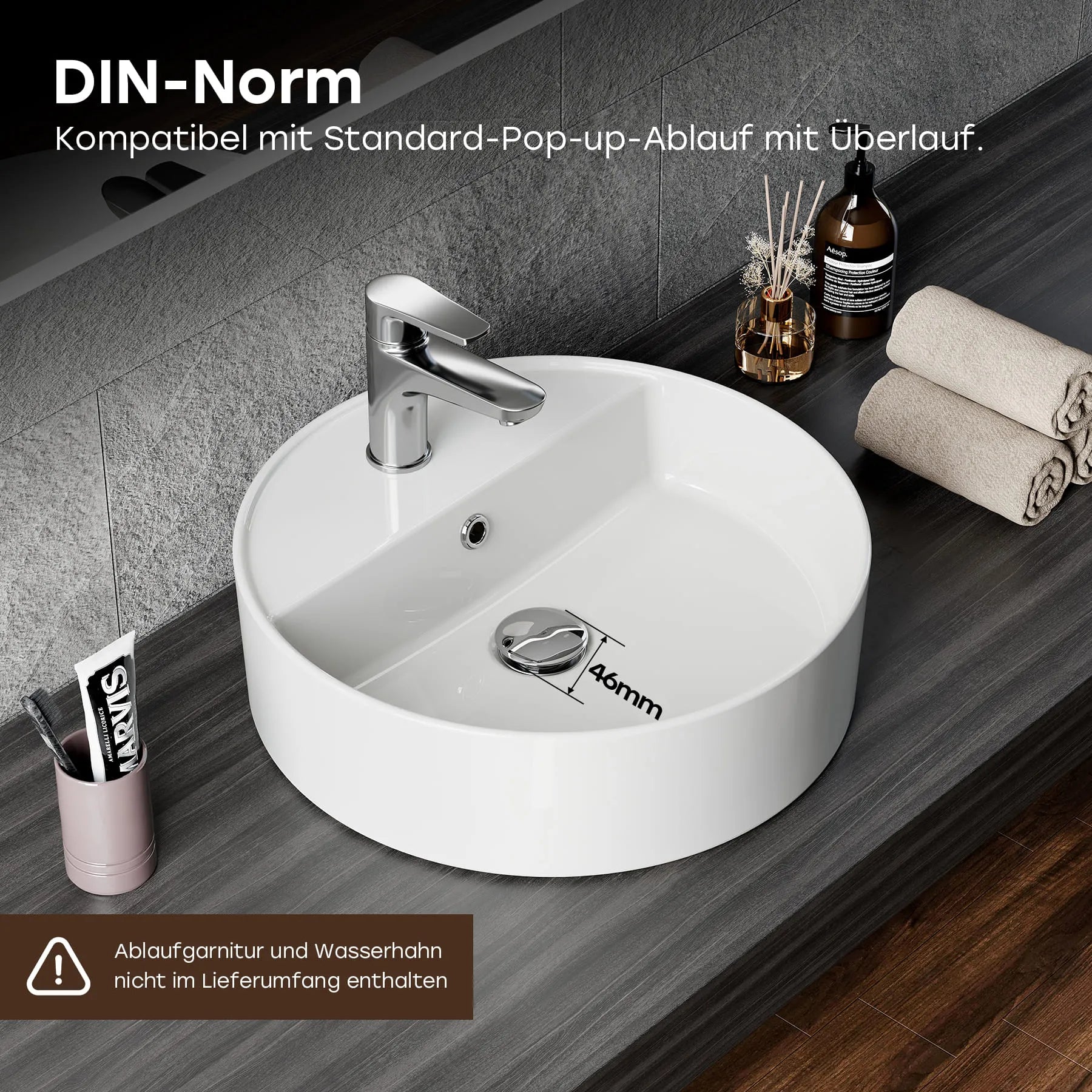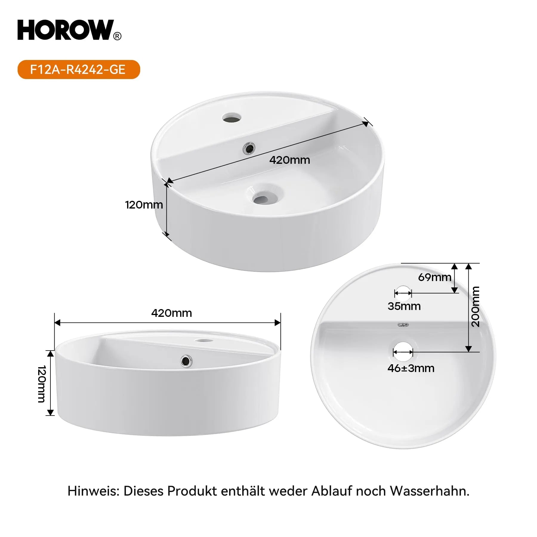 HOROW F12A-R4242 Rundes Aufsatzwaschbecken, 42 cm, Weiß, Hahnloch & Überlauf